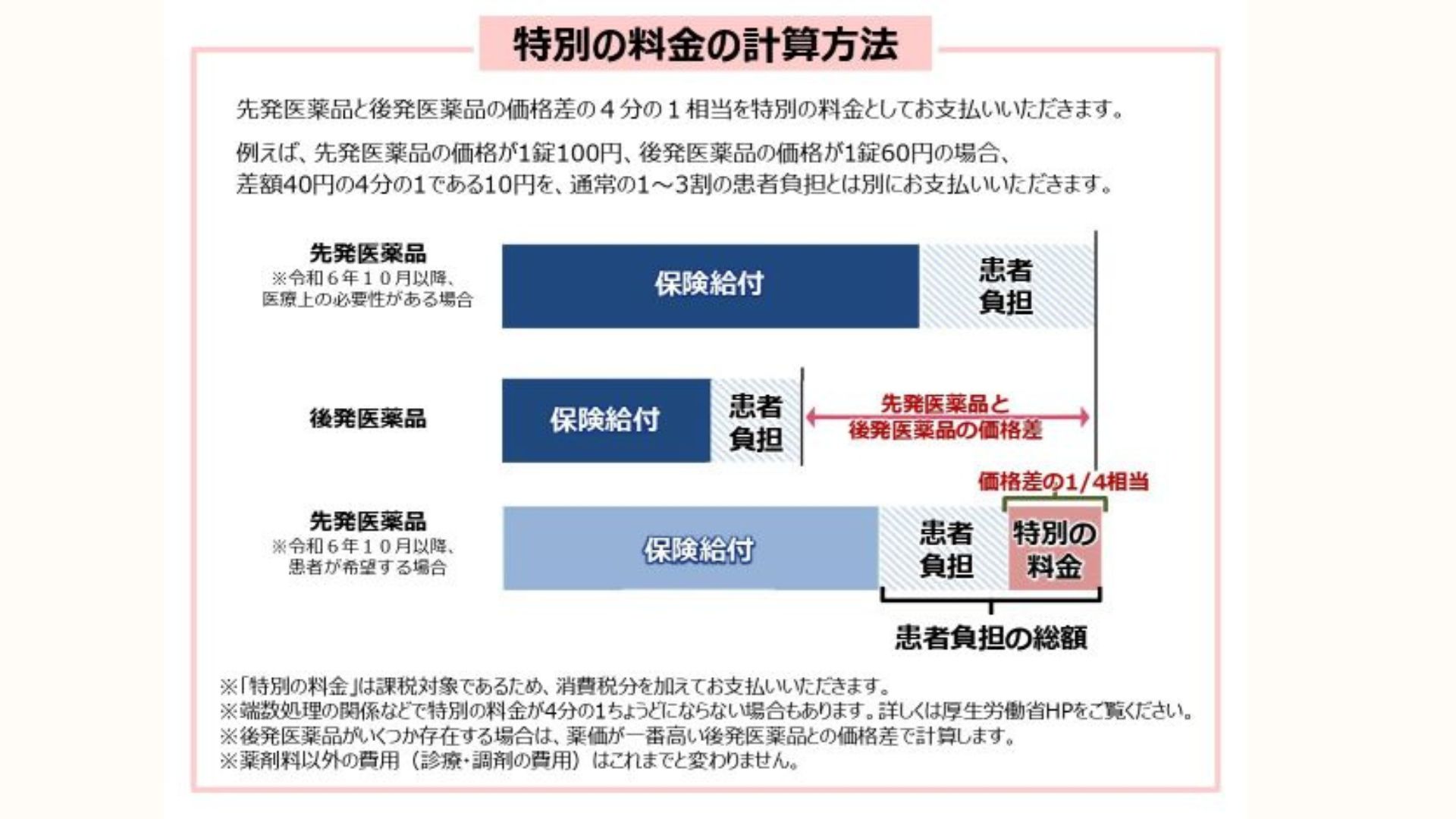 令和6年10月より、後発医薬品(ジェネリック医薬品)が存在する長期収載品(先発医薬品)を、患者さまのご希望により選択された場合、その差額分が「選定療養」として自己負担となる制度が導入されています。